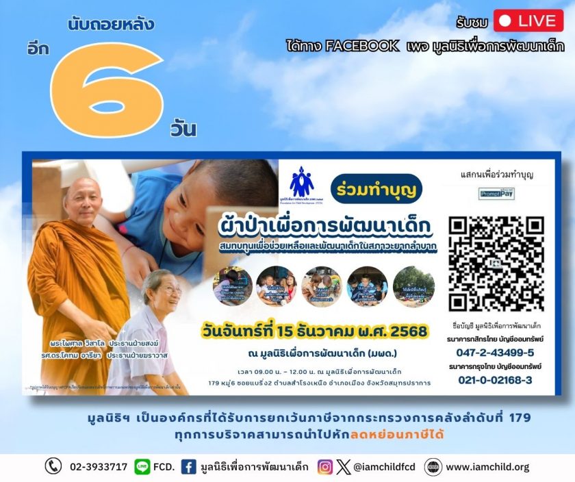 นับถอยหลังอีกเพียง 6 วัน “ผ้าป่าเพื่อการพัฒนาเด็ก”