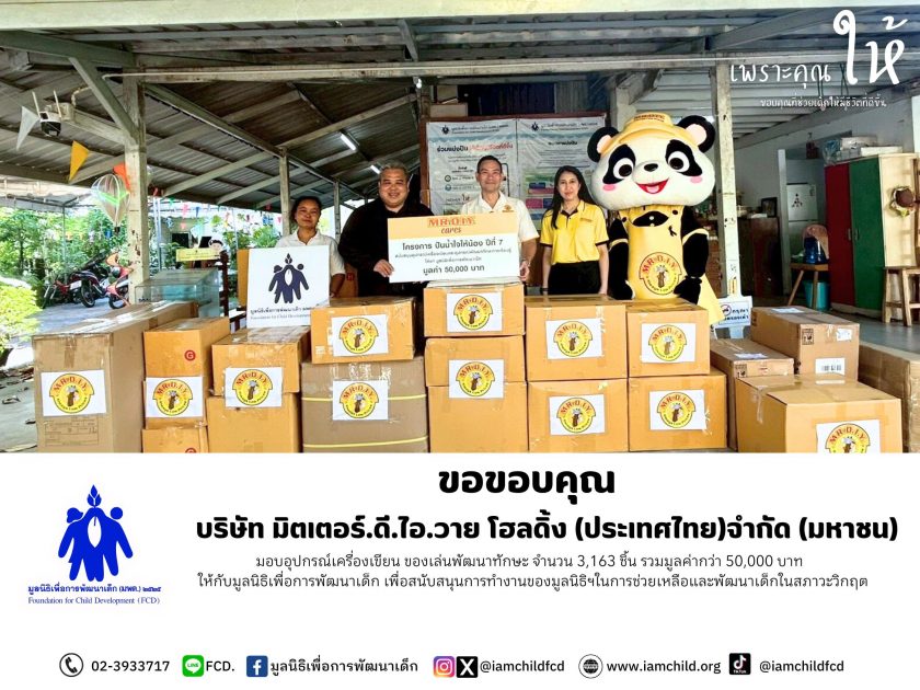 มูลนิธิเพื่อการพัฒนาเด็ก ขอขอบคุณ บริษัทมิตเตอร์.ดี.ไอ.วาย โฮลดิ้ง (ประเทศไทย) จำกัด (มหาชน) มอบอุปกรณ์เครื่องเขียน ของเล่นพัฒนาทักษะ จำนวน 3,163 ชิ้น รวมมูลค่ากว่า 50,000 บาท ให้กับมูลนิธิเพื่อการพัฒนาเด็ก เพื่อสนับสนุนการทำงานของมูลนิธิฯในการช่วยเหลือและพัฒนาเด็กในสภาวะวิกฤต
